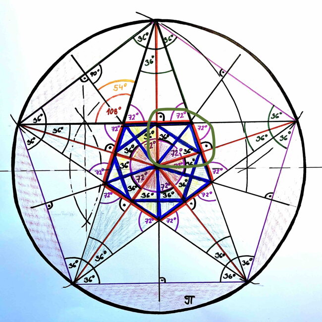Nákres s dalšími úhly, které je opět možné numerologickým součtem zjednodušit až na číslo 9.
