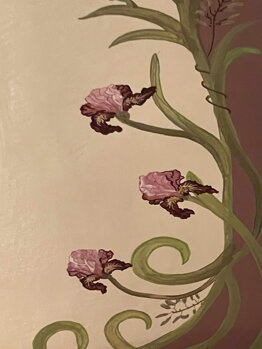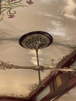Vůz má ručně malované dekory, dřevěné obložení a mosazné detaily.