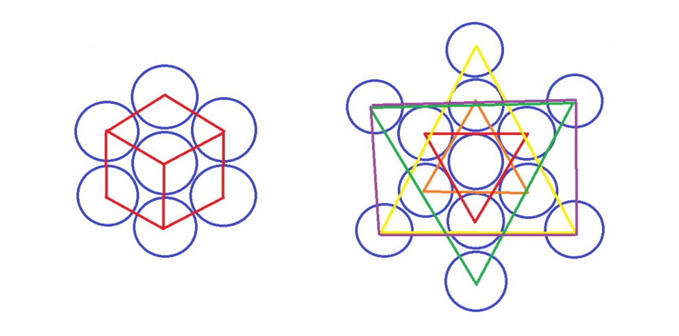 Zleva: Metatronova krychle, dvojitý, tvz. "hvězdný", čtyřstěn (Davidova hvězda), šestistěn (krychle), osmistěn, dvánáctistěn a dvacetistěn."